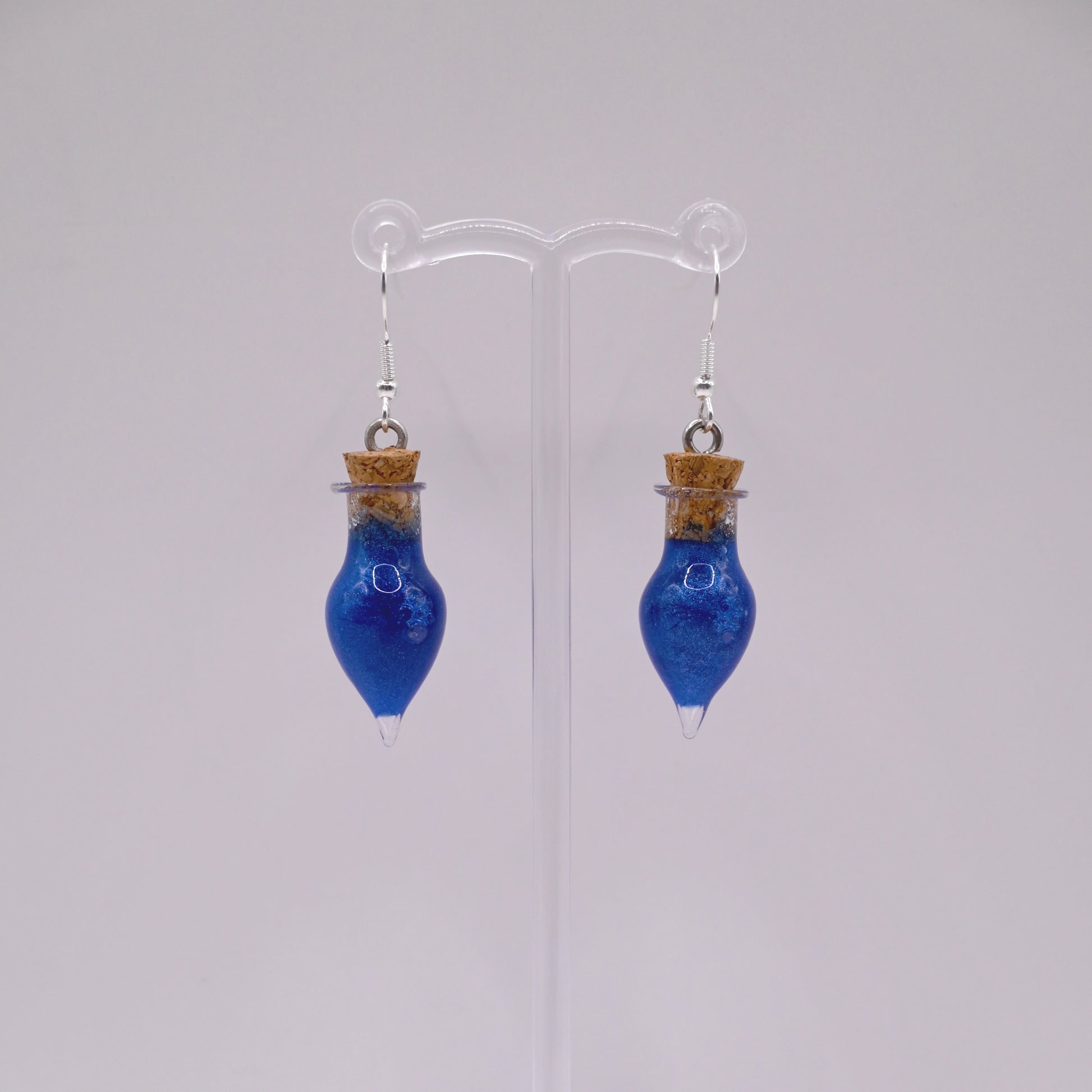 The name says it all: tiny vials of sparkling deep blue ocean captured into earrings — that glows in the dark (need I say more?). Made for lovers of the ocean, and the deep blue. Please note, the glow-in-the dark pigment can be seen pooled at the back of the earrings (not directly visible while wearing), hence the price was slightly lowered to consider the fact.
